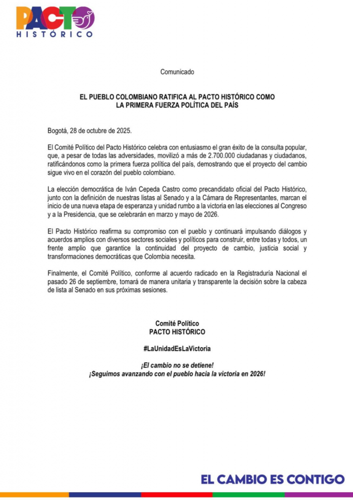 “El Comité Político del Pacto Histórico celebra con entusiasmo el gran éxito de la consulta popular, que, a pesar de todas las adversidades, movilizó a más de 2.700.000 ciudadanas y ciudadanos, ratificándonos como la primera fuerza política del país”, aseguró la colectividad en un comunicado, destacando que el “proyecto del cambio sigue vivo en el corazón del pueblo colombiano”.
