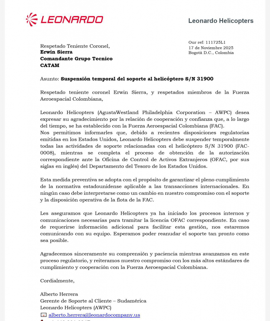 Mientras Petro denuncia una “campaña internacional” contra él y otras figuras que defienden causas humanitarias, la carta enviada por Leonardo Helicopters intenta justificar la suspensión como una “medida preventiva” mientras tramitan una licencia OFAC en Estados Unidos. Un argumento que, para muchos, no oculta el trasfondo político que ha rodeado toda esta ofensiva contra el Gobierno colombiano.