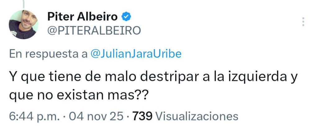 El comediante Piter Albeiro ha encendido una mecha que amenaza con explotar la frágil convivencia democrática de Colombia. Durante la actual contienda electoral, Albeiro, quien ha mostrado respaldo público al aspirante derechista Abelardo de la Espriella, publicó un mensaje y luego lo borró que dejó a más de uno boquiabierto: “¿Y qué tendría de malo destripar a la izquierda y que no existan más?”